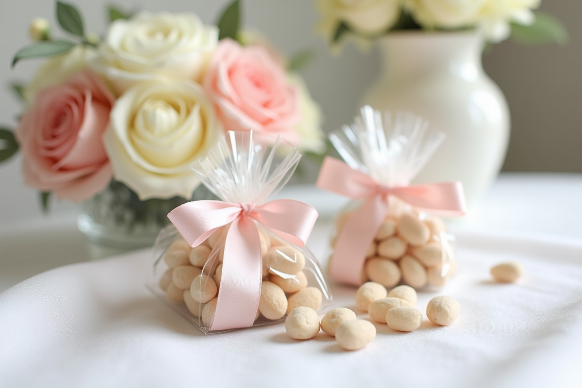 Une autre approche consiste à distribuer les dragées à la fin de la soirée. Les mariés ou leurs parents remettent alors ces petites douceurs en main propre, souvent accompagnées d’un mot de remerciement ou d’une carte personnalisée. Cette pratique renforce le lien entre les hôtes et leurs invités, ajoutant une touche personnelle à ce geste de gratitude.