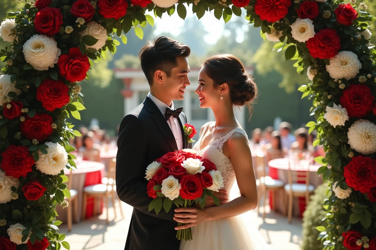 Pour les mariés, optez pour une robe de mariée blanche avec des touches de rouge. Une ceinture rouge ou des détails floraux rouges apporteront une note de couleur sans surcharger la tenue. Pour monsieur, un costume noir avec une cravate ou un nœud papillon rouge, assorti à la boutonnière, sera du plus bel effet.