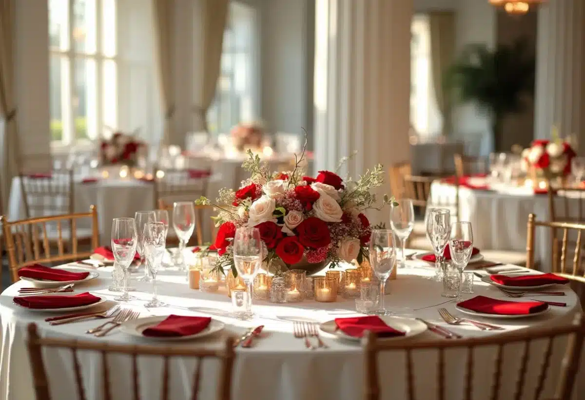 La réception doit être une extension harmonieuse de la cérémonie. Pour les tables, optez pour des nappes blanches avec des chemins de table rouges. Les centres de table peuvent varier entre vases de roses rouges et bougies blanches sur des supports en cristal. Pensez aussi à des serviettes rouges pliées de manière artistique sur des assiettes blanches pour une présentation soignée.