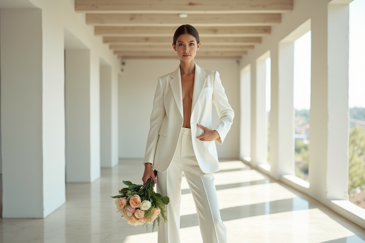 La tenue mariage femme ne se limite plus à la dentelle ou au tulle. Le costume blanc pour mariage femme séduit par sa sobriété sophistiquée : une veste ajustée, un pantalon cigarette, parfois un gilet, pour une allure graphique, presque architecturale. Ce choix traduit une volonté de s’affranchir des conventions, d’affirmer sa personnalité et de créer un moment singulier, inscrit dans l’air du temps.