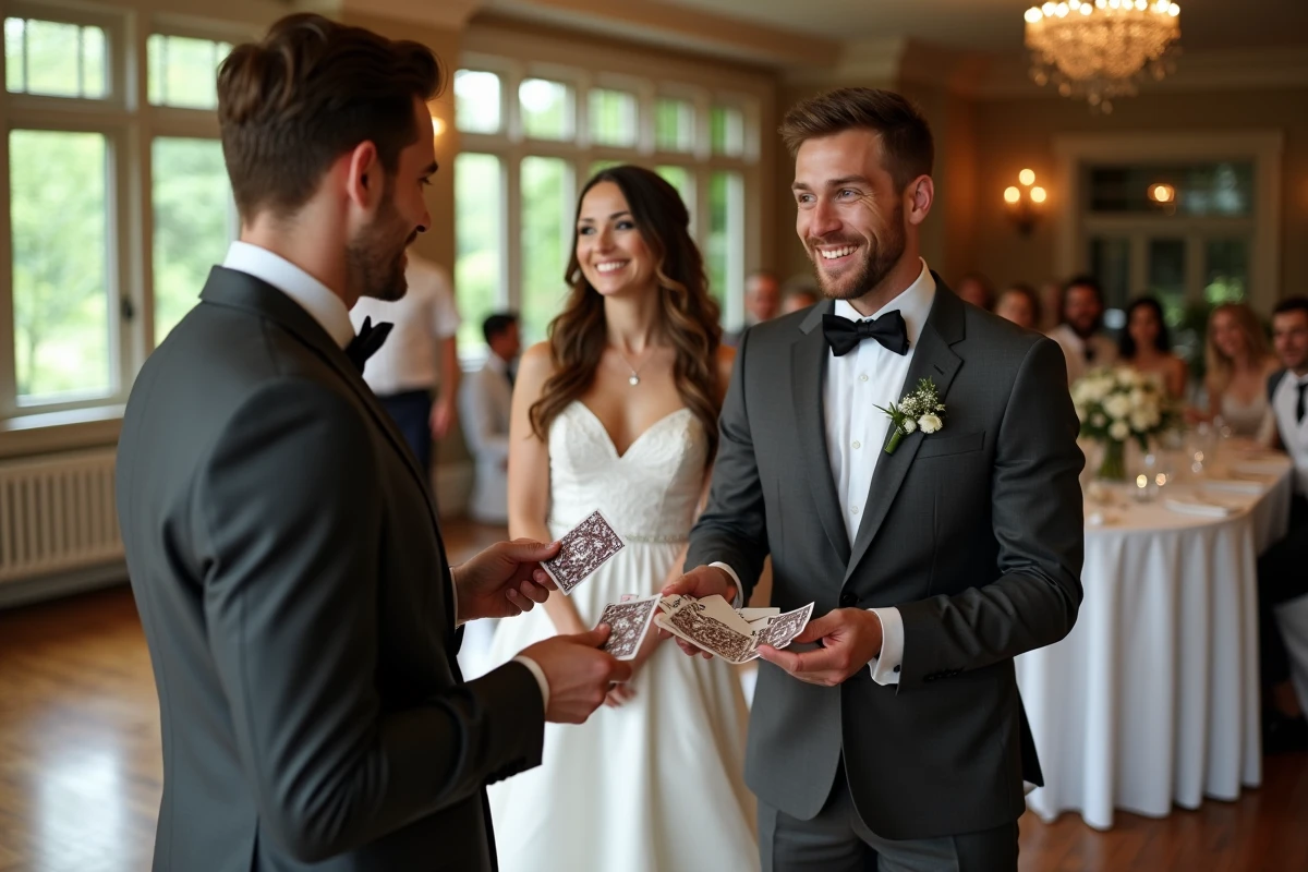 Une ambiance magique mariage s’installe naturellement lors d’une animation soirée mariage où le magicien professionnel mariage sollicite la participation active des invités : choix des cartes, manipulation d’objets personnels, interaction en groupe. Cette animation originale mariage brise la glace et fédère toutes les générations autour de la magie close-up Lyon.